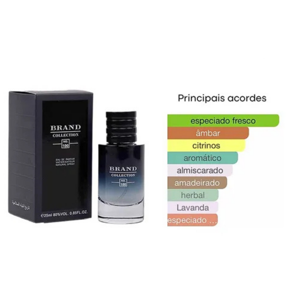 Descubra o Perfume Brand Collection No 100 Masculino, uma miniatura de 25ml em formato Eau de Parfum que traz uma experiência olfativa única.